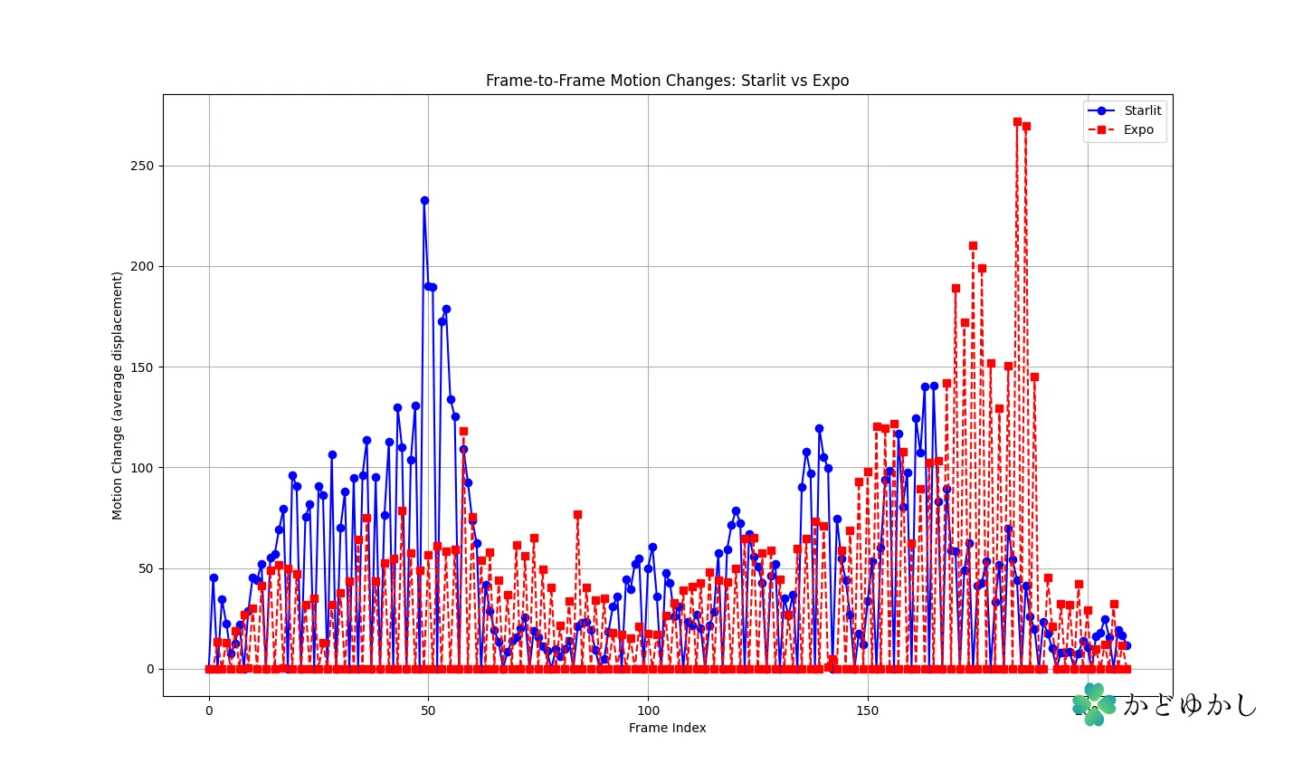 ですが、同様のシーンではあるが同一のシーンではないので限界があります。 キャラクターや舞台、カメラワークの違いを埋めることはできませんし、単一方向の映像のみではXY軸方向の回転運動を比較できません。